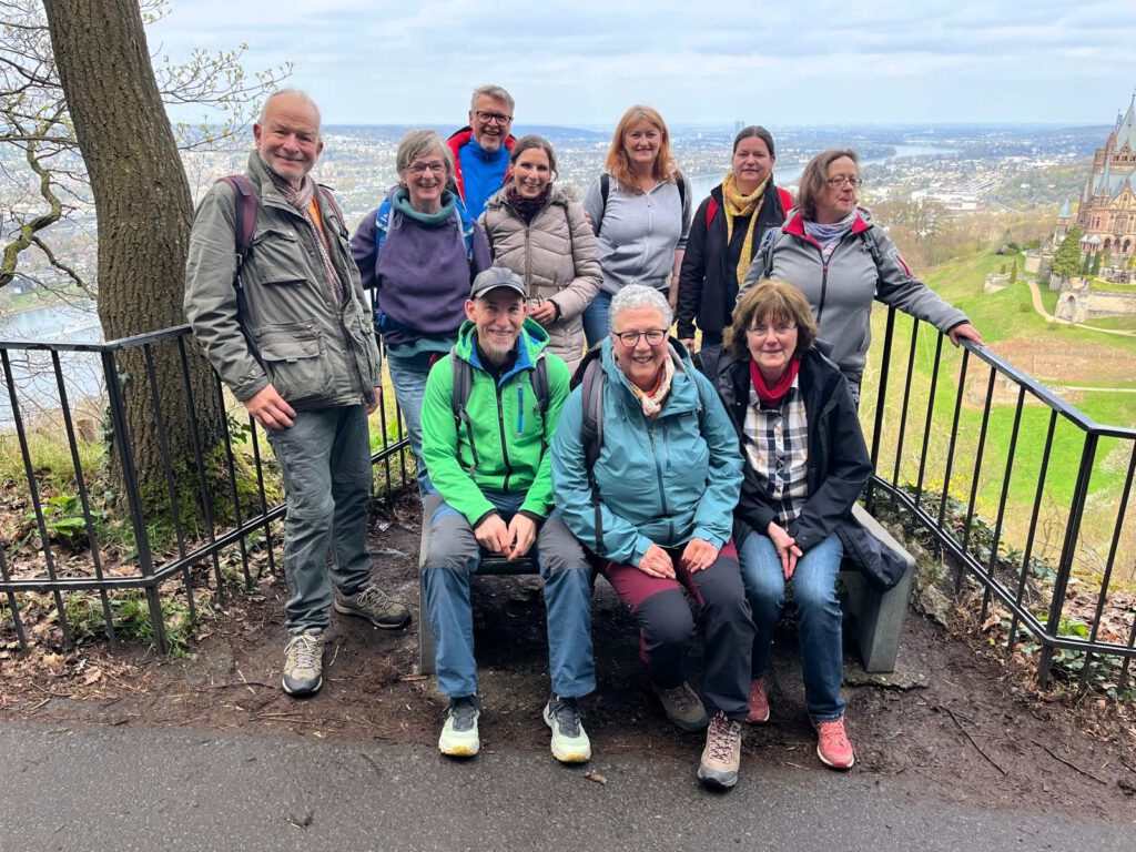 In Fahrgemeinschaften ging es mit drei PKW zum Parkplatz P3 in Königswinter. Von der Talstation der Drachenfelsbahn starteten wir unseren Aufstieg über den Eselspfad. Vorbei an der Nibelungenhalle und der imposanten Drachenburg erreichten wir schließlich den Aussichtspunkt auf dem Drachenfels. Dort legten wir eine kurze Rast ein und genossen bei inzwischen hervorkommender Sonne den herrlichen Blick über den Rhein. Anschließend führte uns der Weg weiter an der Wolkenburg vorbei bis zum Milchhäuschen, wo wir eine gemütliche Kaffeepause einlegten.
